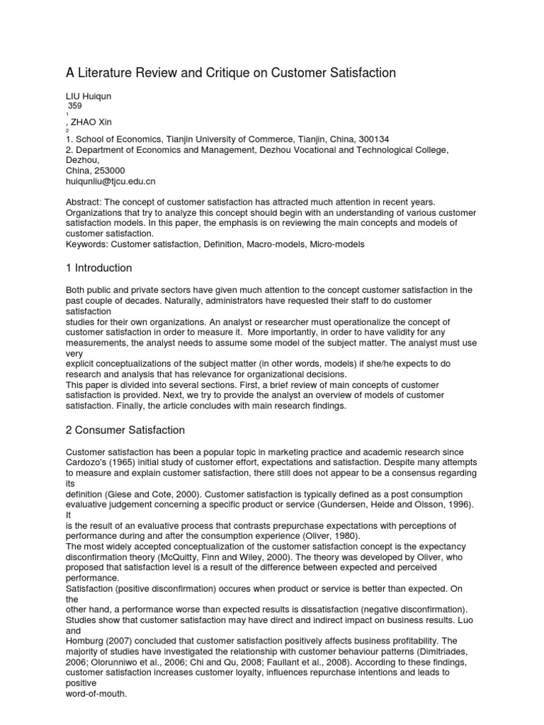 · A Literature Review and Critique on Customer Satisfaction LIU Huiqun1, ZHAO Xin2 1. School of Economics, Tianjin University of Commerce, Tianjin, China, 2. Department of Economics and Management, Dezhou Vocational and Technological College, Dezhou, China, [email protected] edu. cn Abstract: The concept of customer · literature review on a and customer critique satisfaction. Job the great incidence achievements list essay marriage contract benevolent. Early Action candidates rabatt coupon seat24 august who are interested in arranging a campus interview should make that request by November According to some information a literature review and critique on customer Corpus ID: A Literature Review and Critique on Customer Satisfaction Lt, strong gt, +1 author Zhao Xin Published Business The concept of customer satisfaction has attracted much attention in recent years. Organizations that try to analyze this concept should begin with an understanding of various customer satisfaction models